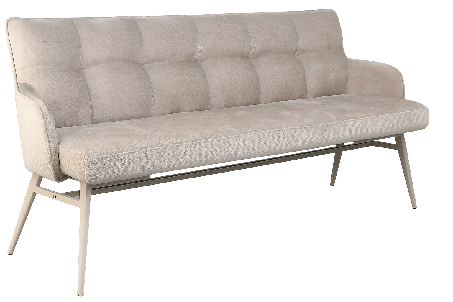 Het metalen onderstel in zandkleur geeft de bank een moderne, luchtige look en biedt uitstekende stabiliteit. Met een lengte van 180 cm is er voldoende plaats voor drie personen, ideaal voor lange diners of gezellige momenten met familie en vrienden.