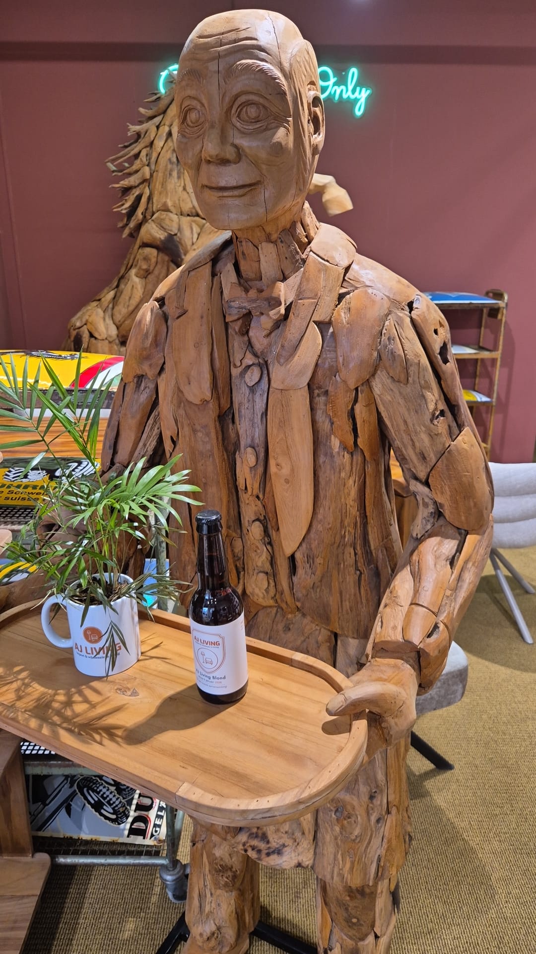 Maak een indrukwekkend statement in uw winkel, showroom of horecazaak met dit unieke, handgemaakte butlerbeeld van massief teakhout. Dit levensgrote decoratieve beeld is met vakmanschap gesneden en toont een stijlvolle heer in kostuum die een dienblad presenteert – perfect voor het serveren van drankjes, het tonen van producten of als opvallende eyecatcher.